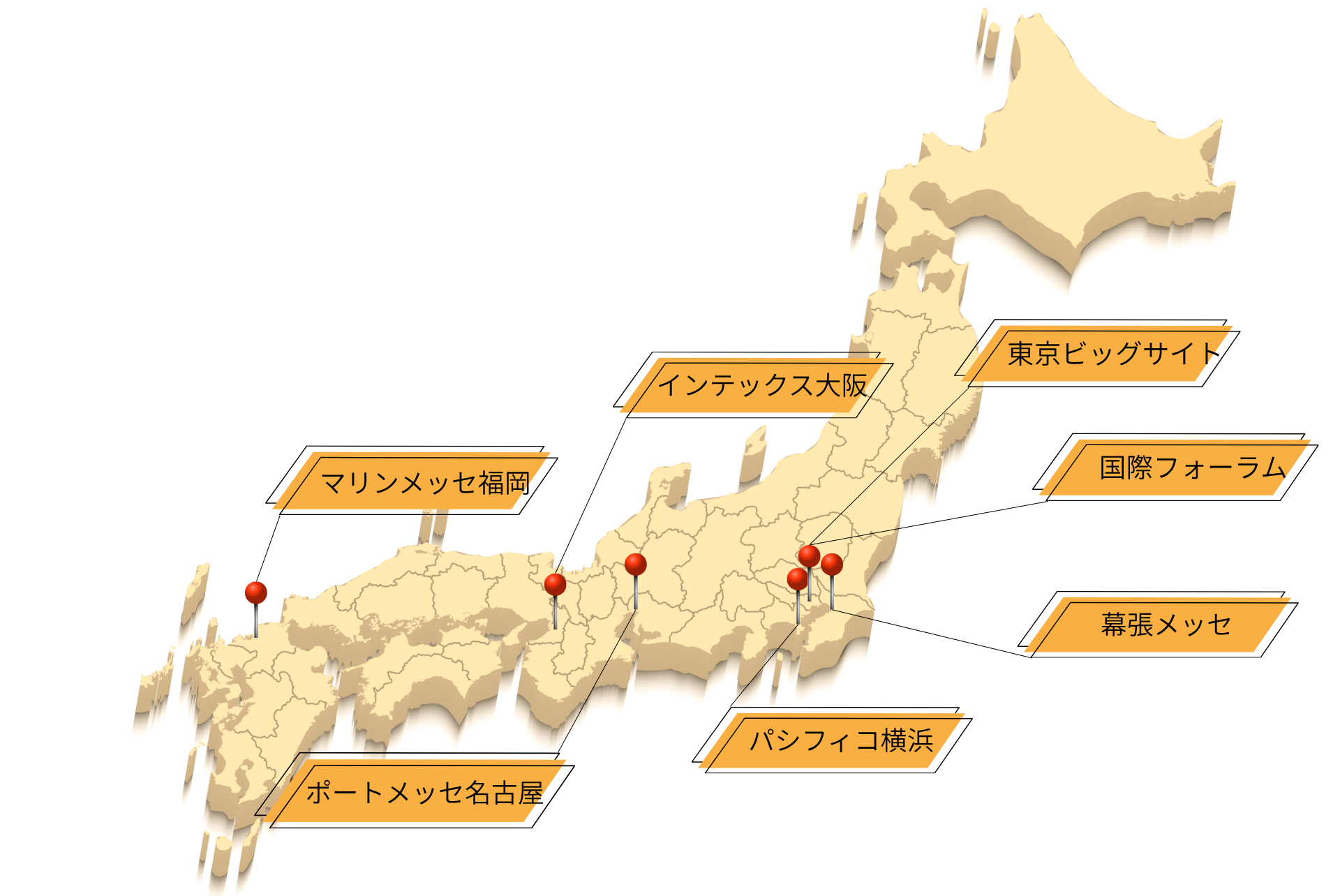 東京ビックサイト、幕張メッセ、国際フォーラム、パシフィコ横浜、ポートメッセなごや、インテックス大阪、マリンメッセ福岡